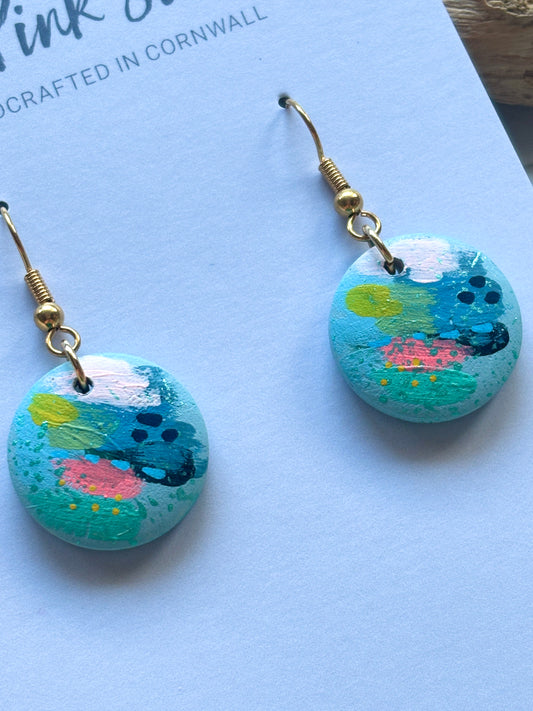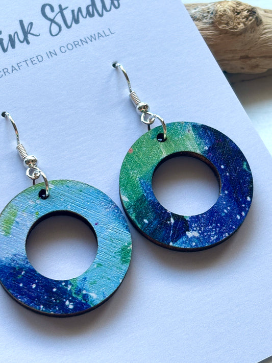Handpainted Blue & Aqua Wooden Ring Earrings