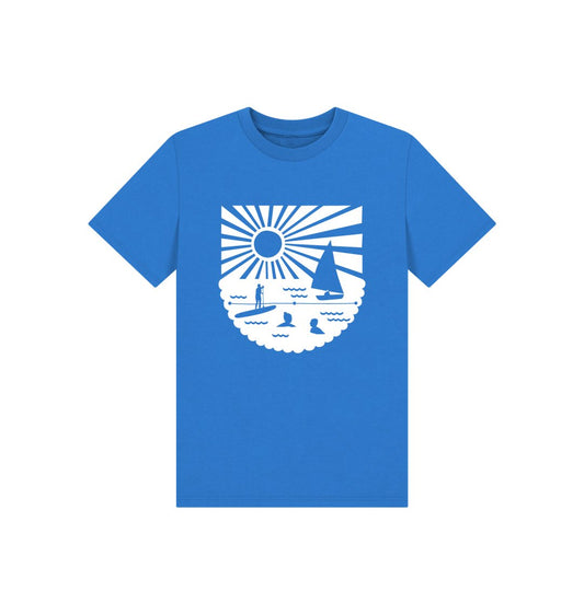 Kids White Organic Tee With Turquoise Blue Readymoney Beach Shop Logo