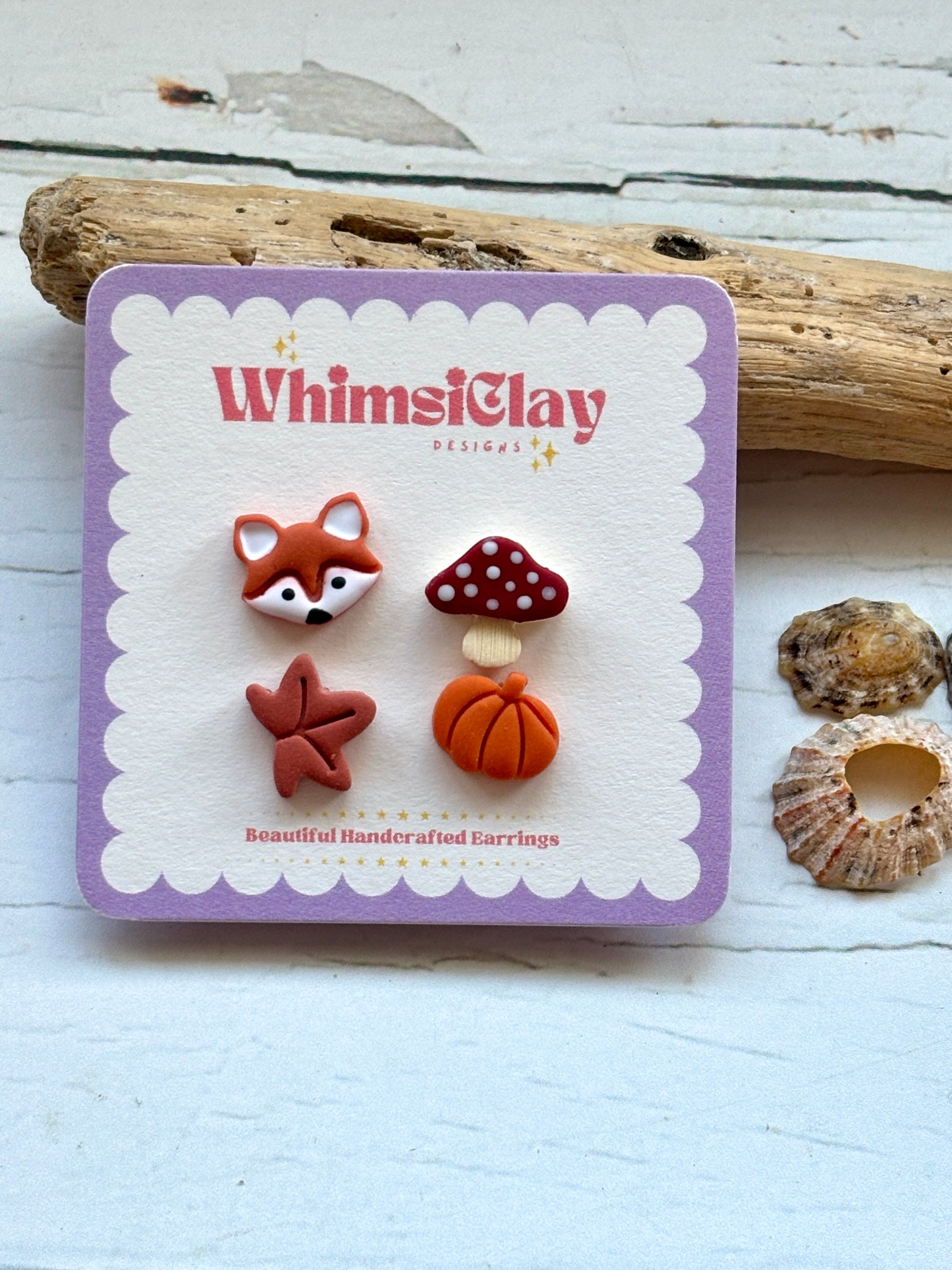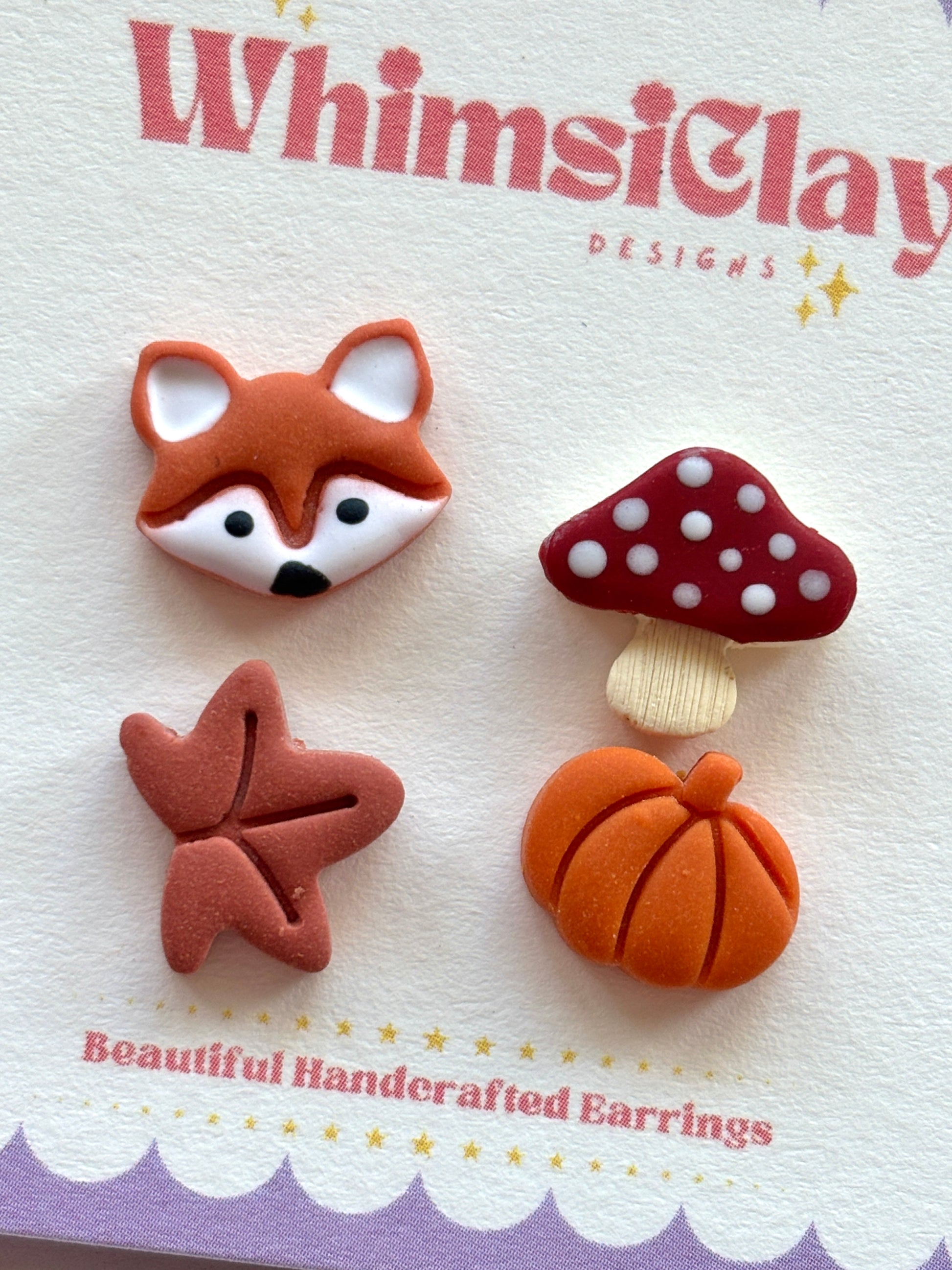 Autumn Inspired Set of 4 Stud Earrings: Fox, Toadstool, Leaf, Pumpkin