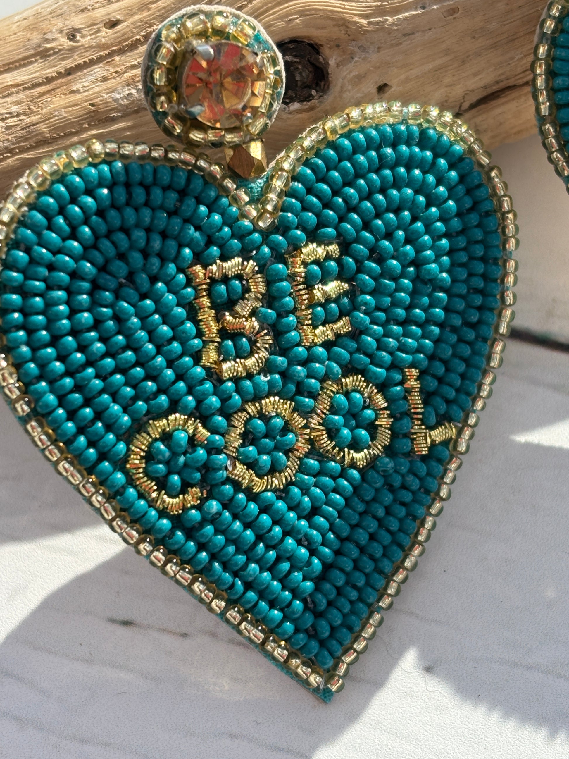 How to truly make a statement with your earrings! These stunning heart shaped earrings each have the words 'be cool" in hand stitched goldwork surrounded by turquoise beads with a gold bead edge and stud fastening.