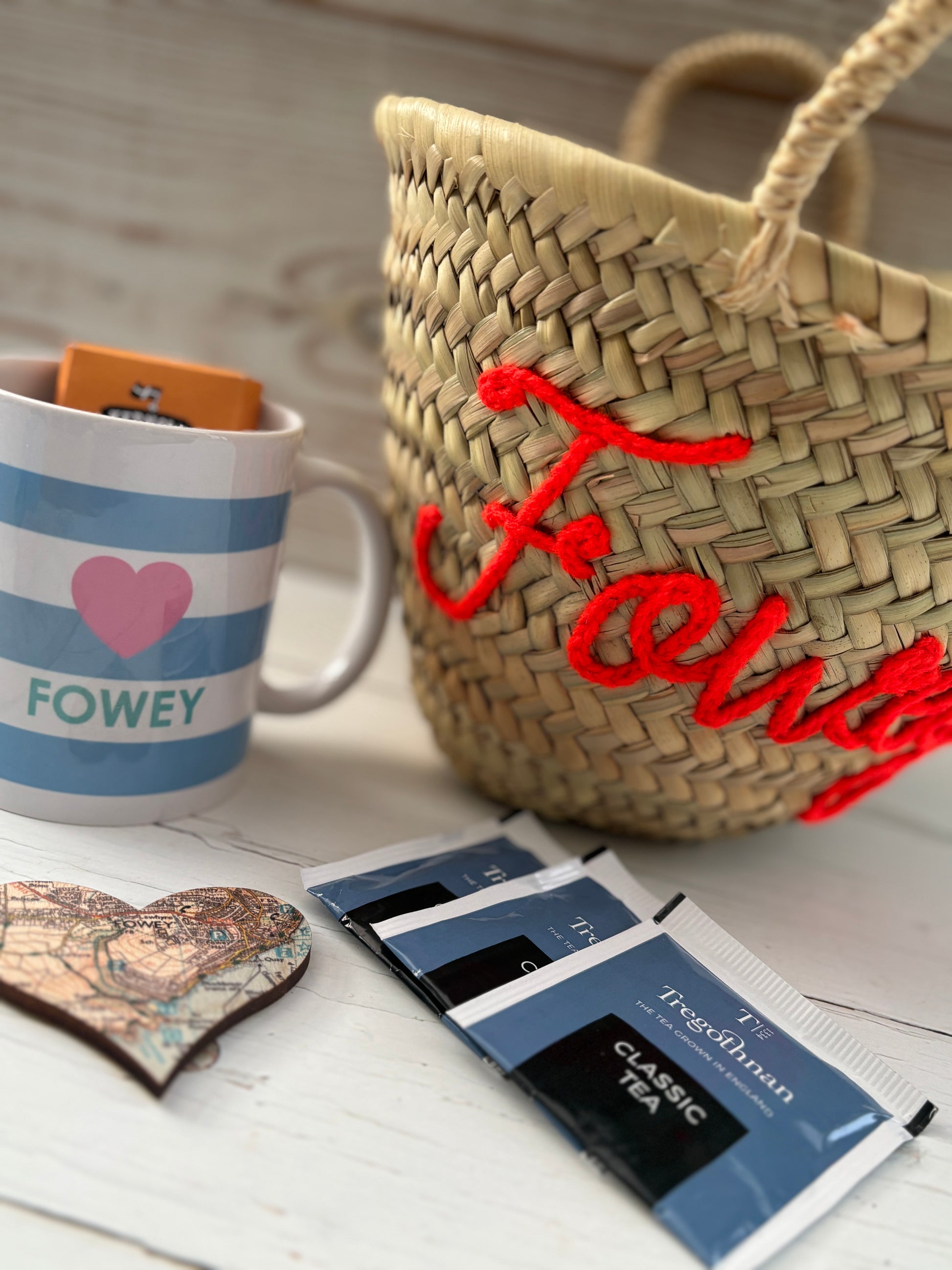 The perfect gift for someone who loves Fowey. Choose one of our very popular mini basket bags, embroidered with the word Fowey and it will be lovingly packed for your recipient including the following: