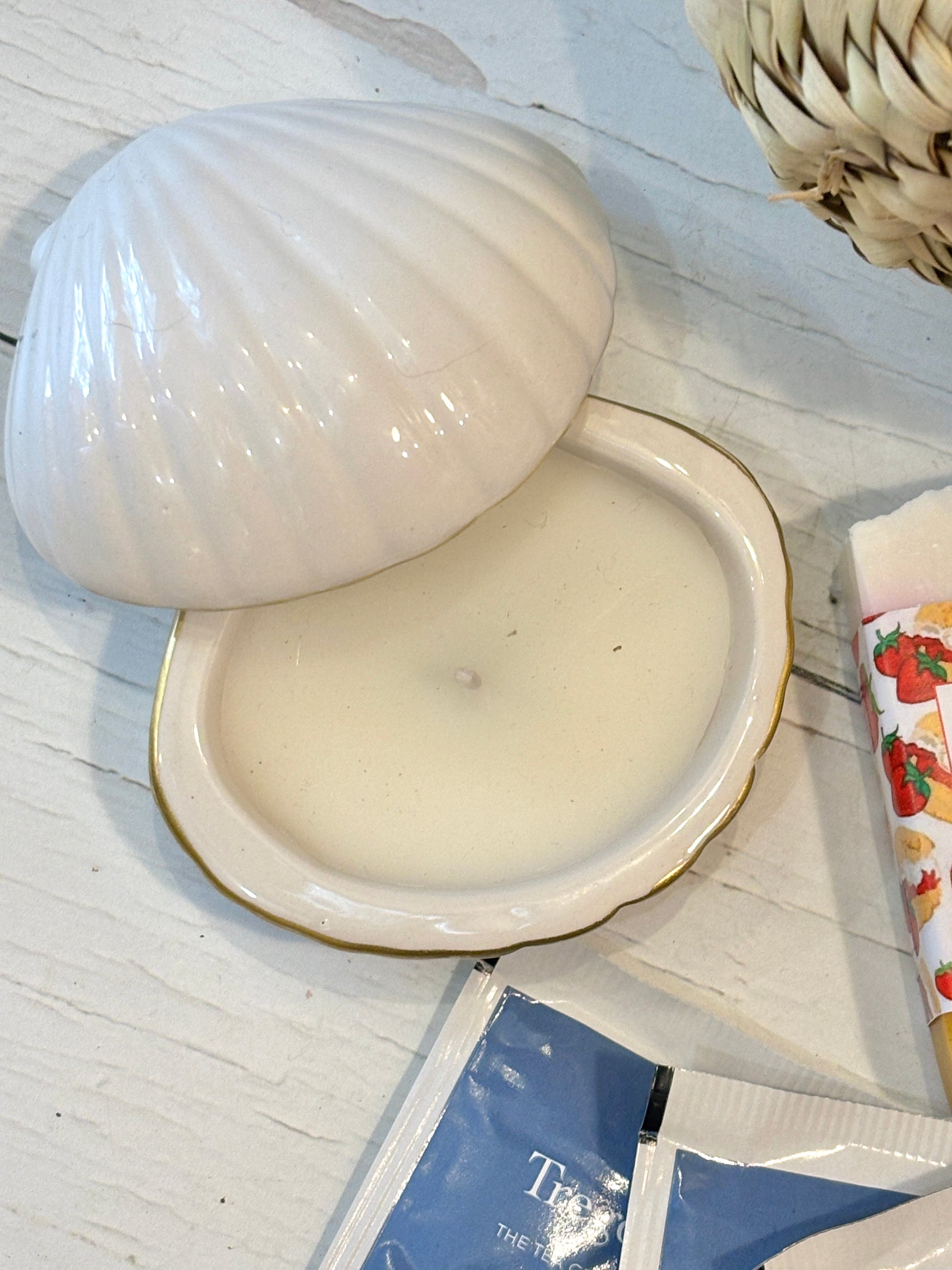 - A lightly coconut scented seashell candle, use the lidded ceramic shell as a keepsake dish for trinkets after the candle has been enjoyed